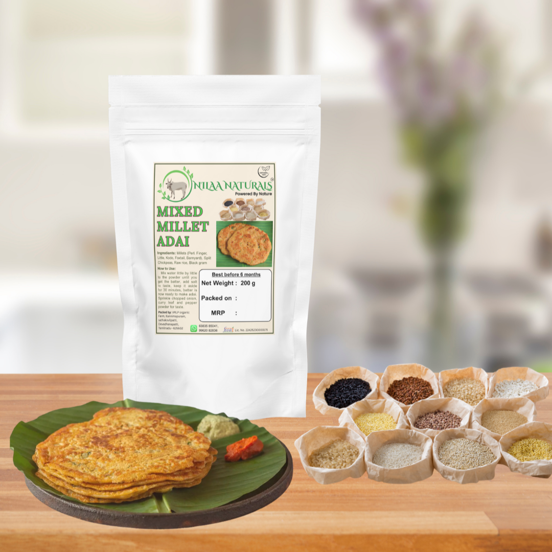 Enjoy the wholesome crunch of Mixed Millet Adai, made from handpicked millets, dals, and mild spices, providing a nutritious and balanced meal.